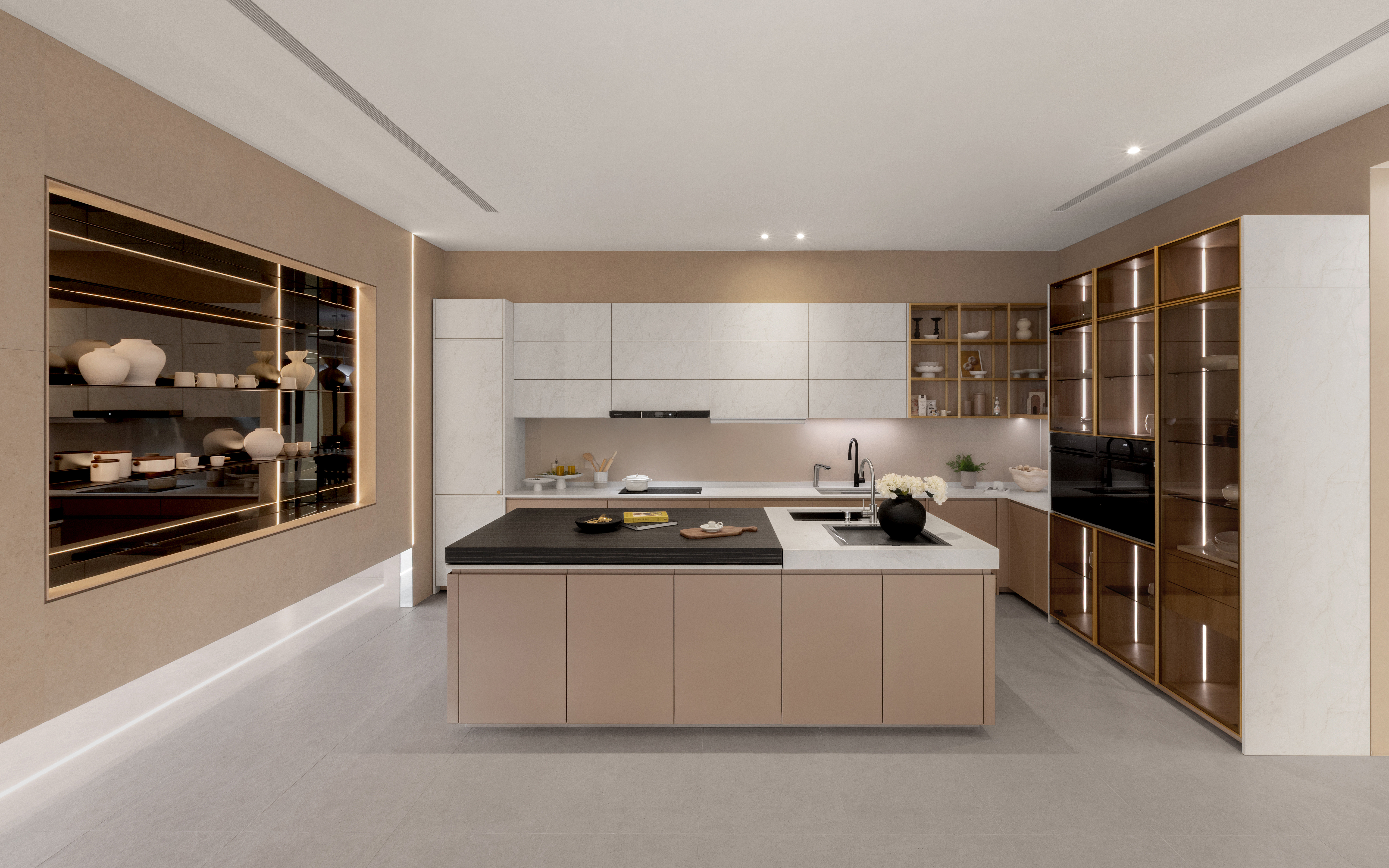 品牌館以 「INFINITY ART MUSEUM」 為設計概念,透過鏡面延伸、天花格柵、通透視線與層次光影,打破既有空間框架,營造宛如現代美術館般的場域氛圍。整體設計以簡潔材質與開放式架構,堆疊出流動且具穿透感的空間語彙,讓展示不只是陳列,更成為一種可被感受與漫遊的生活場景。